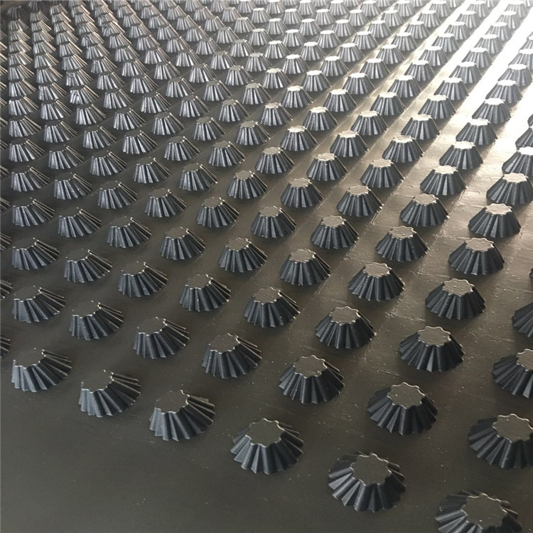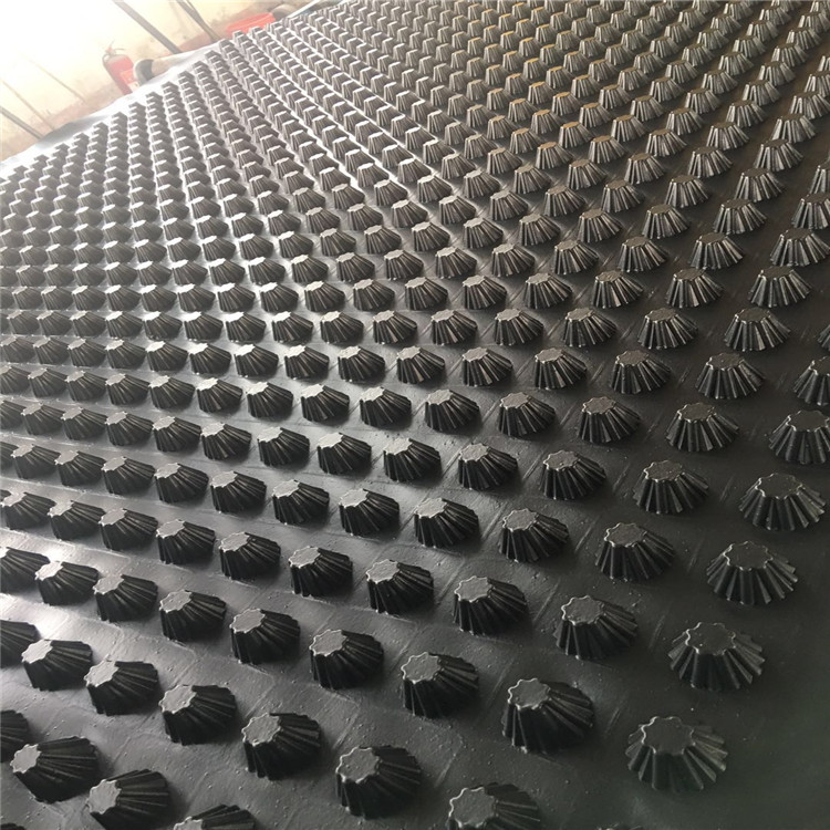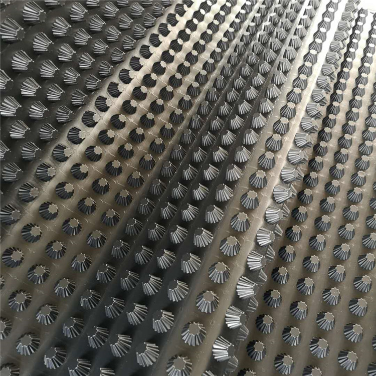 圓錐突臺(tái)的頂面膠接一層過濾土工布,以阻止泥土微粒通過,從而避免排水通道阻塞使孔道排水順暢。 傳統(tǒng)的排水方式使用磚石瓦塊作為導(dǎo)濾層、使用較多的鵝卵石或碎石作為濾水層、將水排到指定地點(diǎn)。而用排水板取代鵝卵石濾水層來排水則省時(shí)、省力又節(jié)能、節(jié)省投資、還能降低建筑物的荷載。
