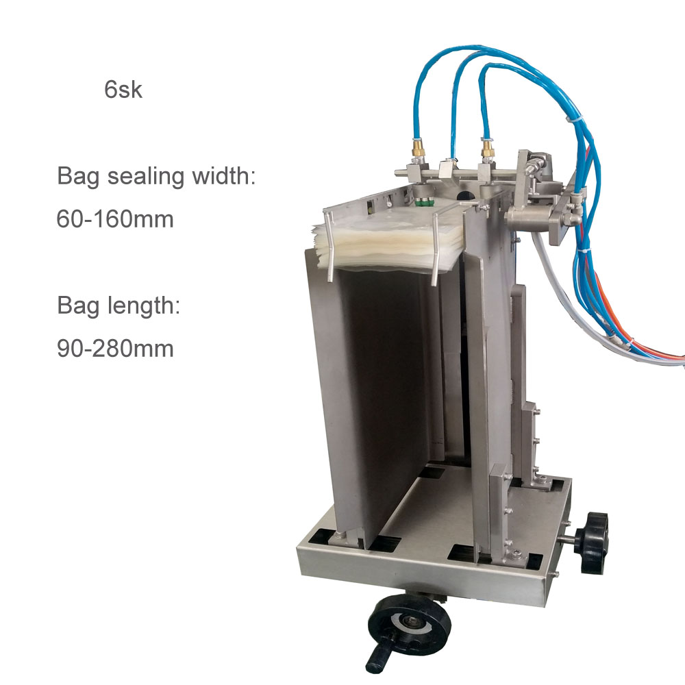 2、下取袋:袋子上取袋部位的上面,通過(guò)吸盤把袋子吸下來(lái),達(dá)到取袋部位,繼續(xù)下面的工作;其優(yōu)勢(shì)為一次加幾百個(gè)袋子,不停機(jī)連續(xù)加袋子;處于連續(xù)工作狀態(tài);其缺點(diǎn)為對(duì)袋子的厚薄度有要求,既不能太厚也不能太薄,太厚的袋子,吸盤吸起來(lái)費(fèi)勁,會(huì)降低產(chǎn)品的產(chǎn)能;太薄的袋子,吸盤吸袋時(shí)會(huì)出現(xiàn)多包現(xiàn)象,造成浪費(fèi),并且在工作過(guò)程中,需要一個(gè)工人在設(shè)備旁邊隨著準(zhǔn)備加袋子,增加工人的工作量。這種給袋方式,在南方給袋式真空包裝機(jī)中常被采用。