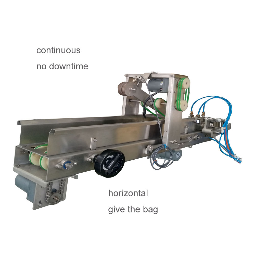 3、平取袋:袋子水平斜放在輸送帶上,根據(jù)輸送帶的長(zhǎng)度可放幾萬(wàn)個(gè)包裝袋,當(dāng)輸送帶運(yùn)送到探測(cè)點(diǎn)時(shí),利用吸盤將袋子吸出上袋;該種上料方式的優(yōu)勢(shì)為可連續(xù)上袋,不停機(jī)連續(xù)運(yùn)動(dòng),一次放的袋子較多幾萬(wàn)個(gè),穩(wěn)定性強(qiáng);但是上料設(shè)備的成本較高,控制方式復(fù)雜,調(diào)試難度大,對(duì)于工人而言操作復(fù)雜,性價(jià)比相對(duì)低,且需包裝厚袋子如鋁箔平面袋,軟袋子易卷邊。這也是一種比較實(shí)用的給袋方式。